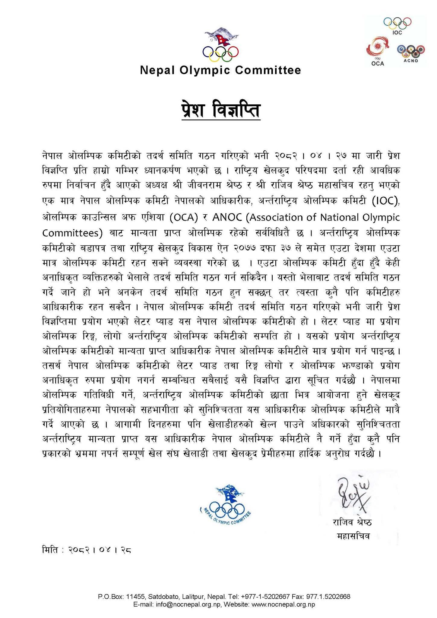 श्रावण २८ गते, बुधबार पोखरा ।। अन्तर्राष्ट्रिय मान्यता प्राप्त नेपाल ओलम्पिक कमिटी (एनओसी)ले नेपालमा...